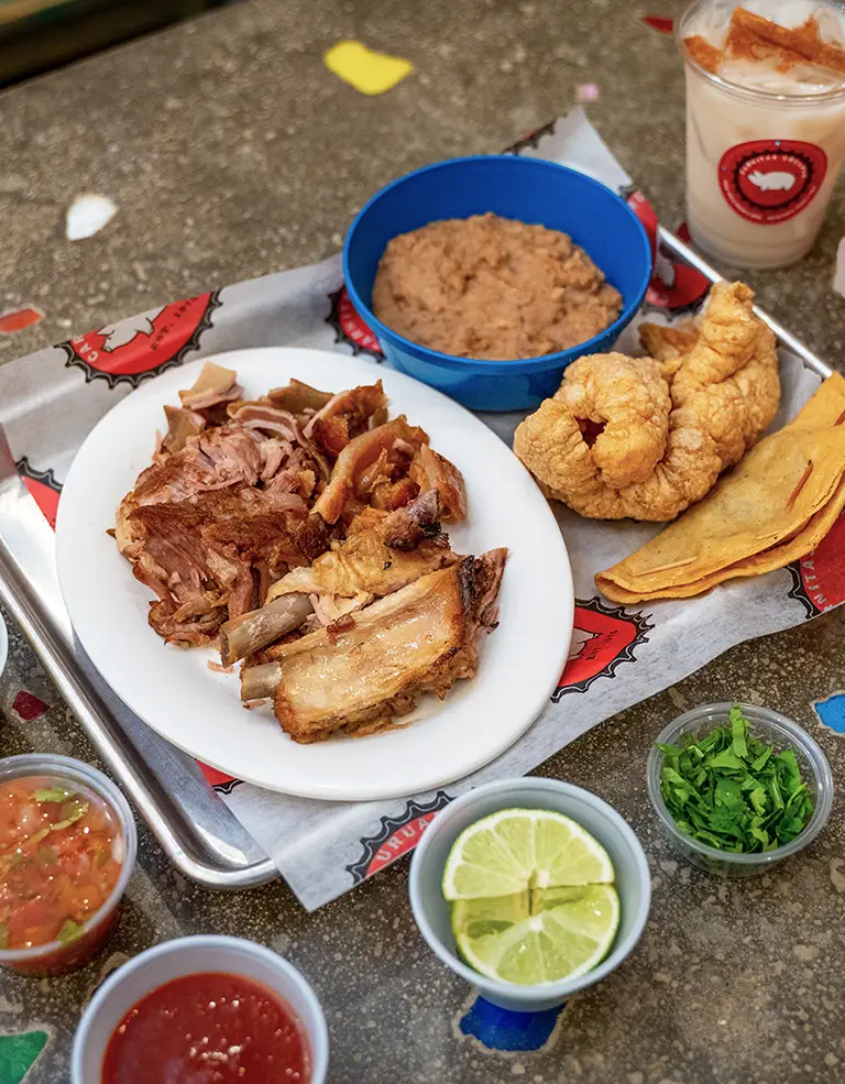 1/2 Libra de Carnitas. 1 Taco Dorado. Chicharrones. Frijoles. 1 Agua Fresca 12 oz.